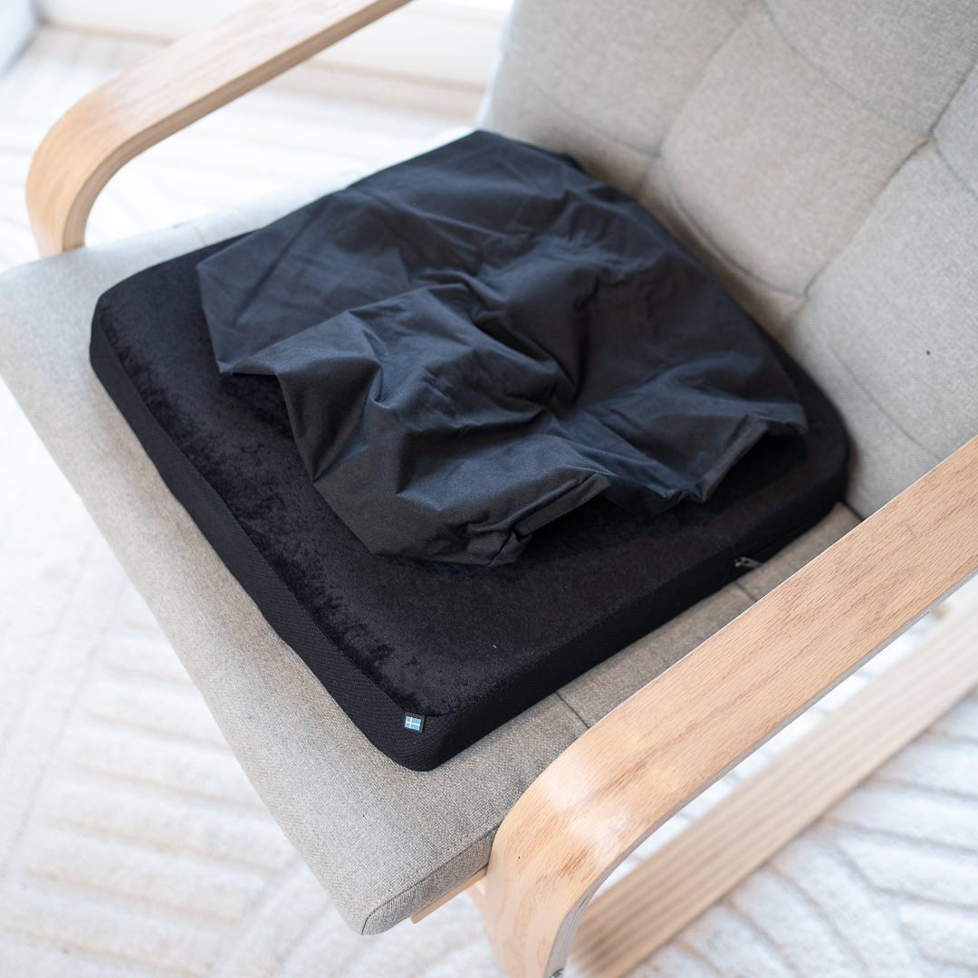 Trekket er laget av slitesterk, elastisk velur med sklisikker underside som holder puten på plass i alle typer rullestoler. Inkontinenstrekk følger med som standard og beskytter både pute og trekk.