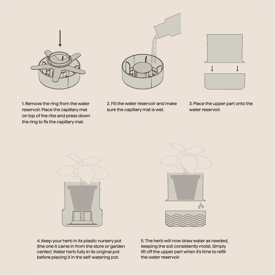 Potten har plass til innerpotter med en bunn på opptil 9 cm og et vannreservoar på 350 ml. Kapillærmatten sørger for jevn vanning og kan byttes ut ved behov. Vi anbefaler håndvask for å bevare form og farge, men den tåler også oppvaskmaskin. Husk å vanne urten fullt første gang før du plasserer den i potten.