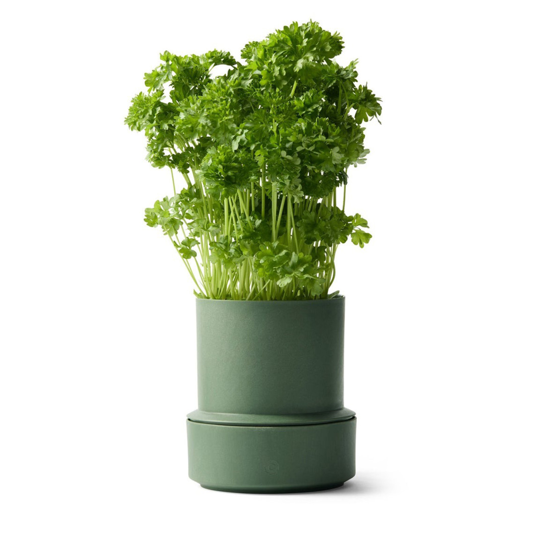 CrushGrind Billund selvvanningspotte i fargen «parsley» kombinerer moderne design med praktisk funksjon. Potten er utstyrt med et smart kapillærsystem som gir urtene jevn tilgang på vann, akkurat når de trenger det. Du fyller bare vann i bunnen, så sørger potten selv for riktig mengde fuktighet. Resultatet er grønne, friske urter som holder seg lenger, uten stress og overvanning.