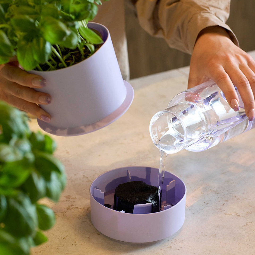Potten bruker en kapillærmatte som trekker vann fra reservoaret og gir urten fuktighet etter behov.