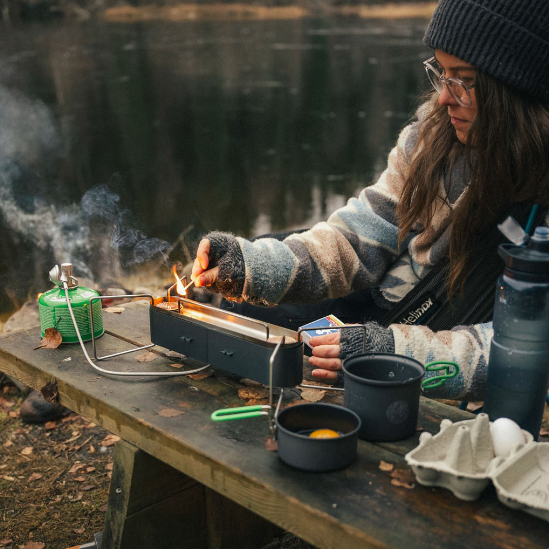Kjøkkenet er også laget for å fungere i virkeligheten, ikke bare på fine sommerdager. Den integrerte vindbeskyttelsen og den lave profilen gjør at flammen står stødigere når det blåser, og den sammenleggbare konstruksjonen gjør at hele kjøkkenet pakkes overraskende kompakt i sekken. I tillegg følger det med et sammenleggbart stativ som støtter både små og store gassbeholdere, helt opp til 450 gram.