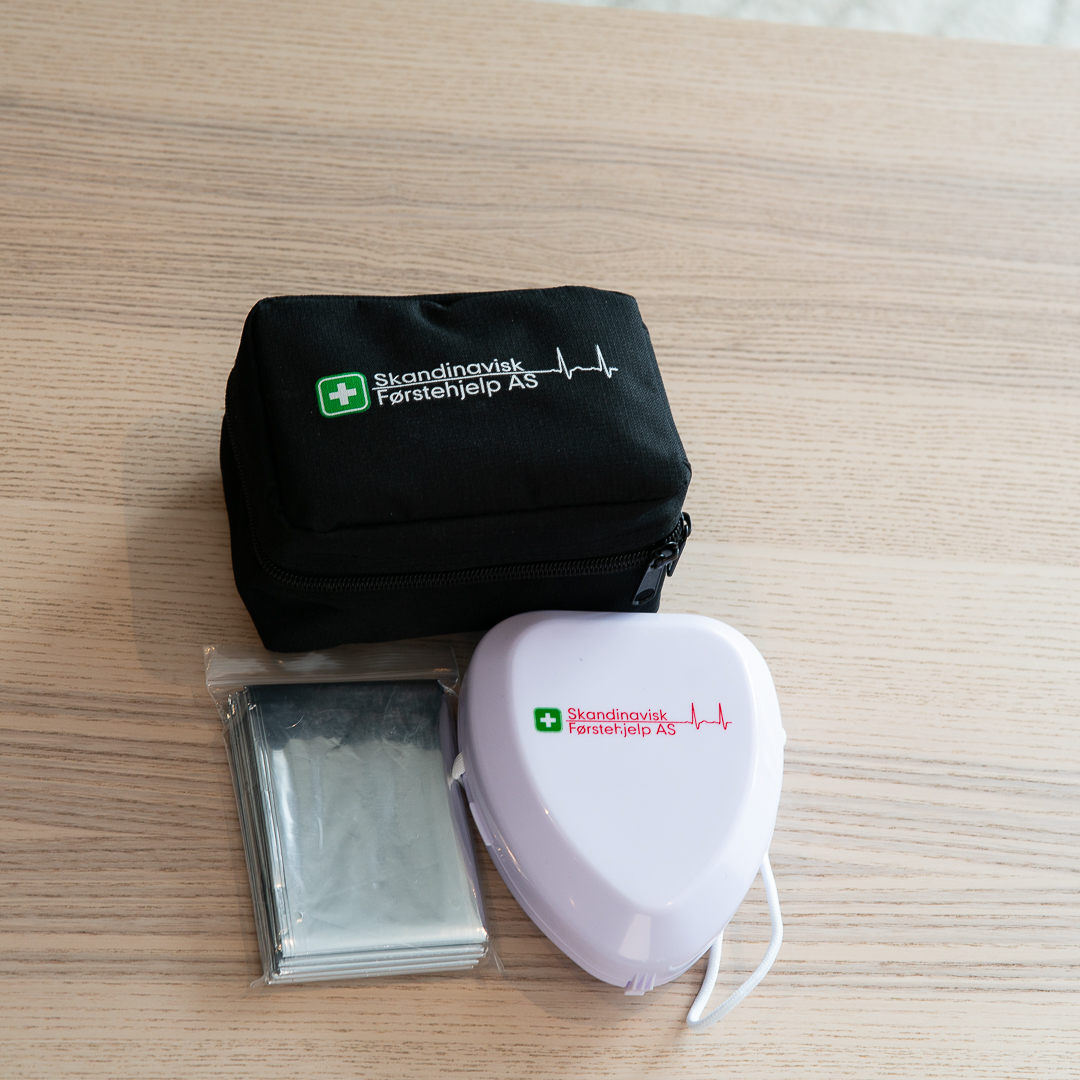 Komplett beredskapspakke med redningsfolie, førstehjelpssett og HLR-maske.