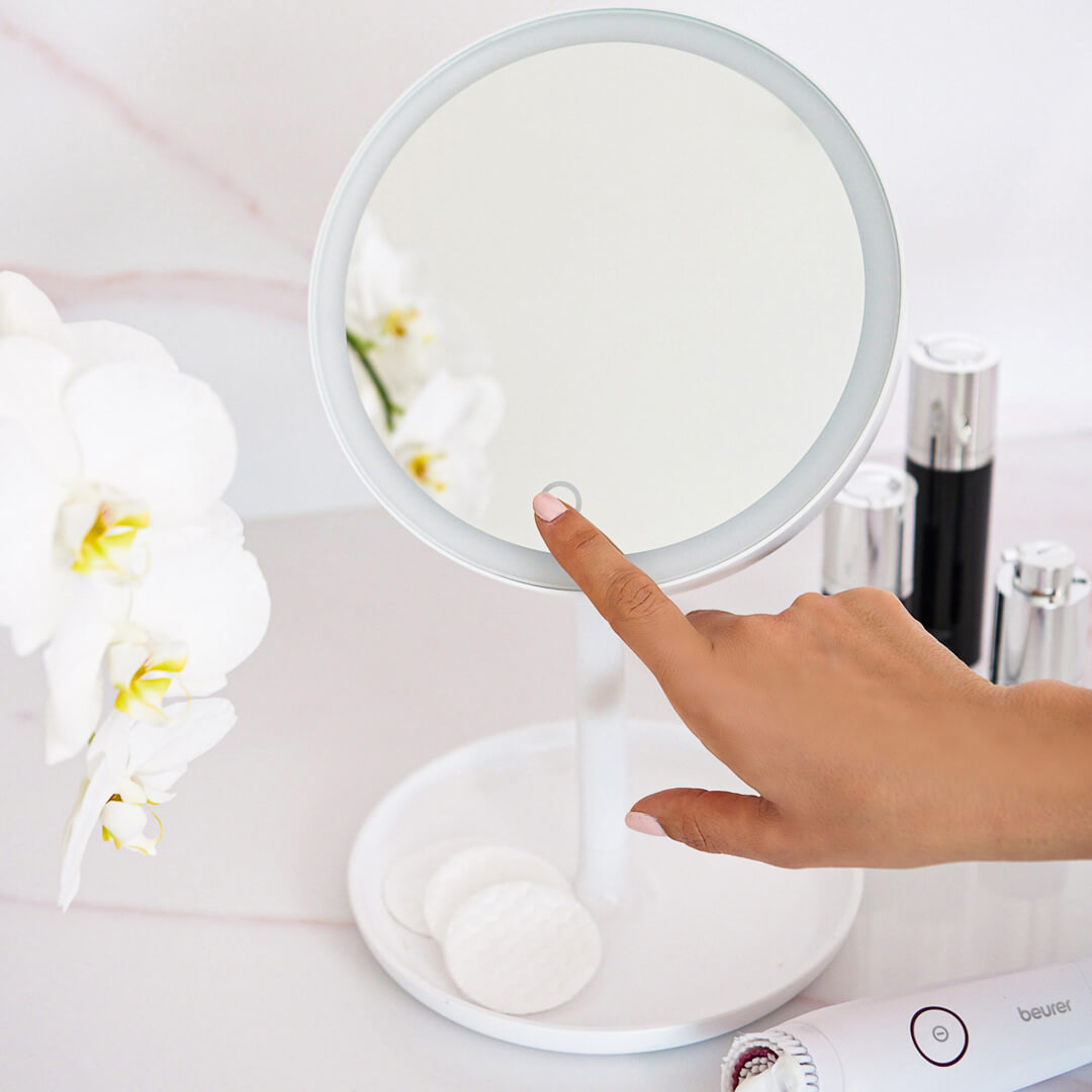 Beurer BS 45 er et trådløst bordspeil som kombinerer stil og funksjonalitet. Med en stor speiloverflate på 17,5 x 17,5 cm gir dette speilet deg god plass for detaljert sminke eller ansiktspleie. LED-belysningen gir et klart og naturlig lys, som er viktig for presis påføring av sminke. LED-lyset er justerbart med en berøringssensor på speiloverflaten, slik at du enkelt kan tilpasse lysstyrken etter dine behov.